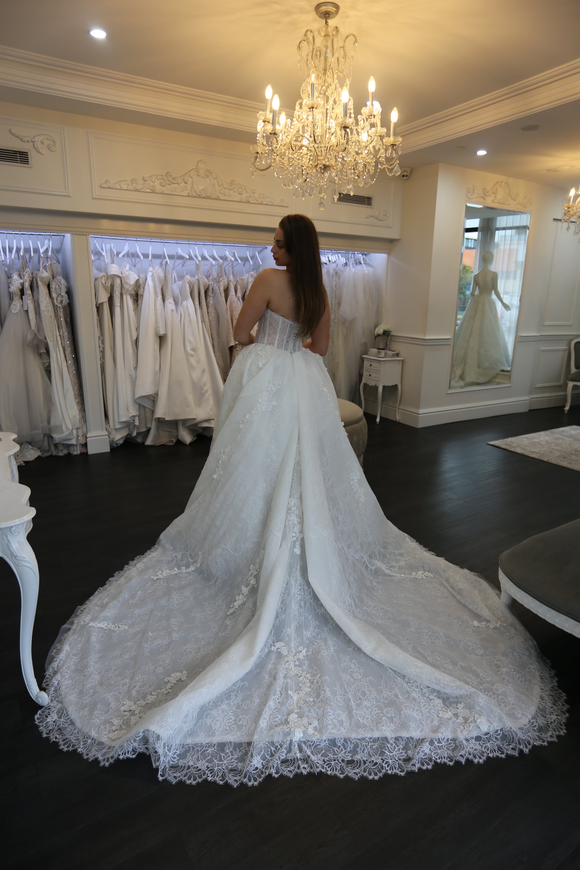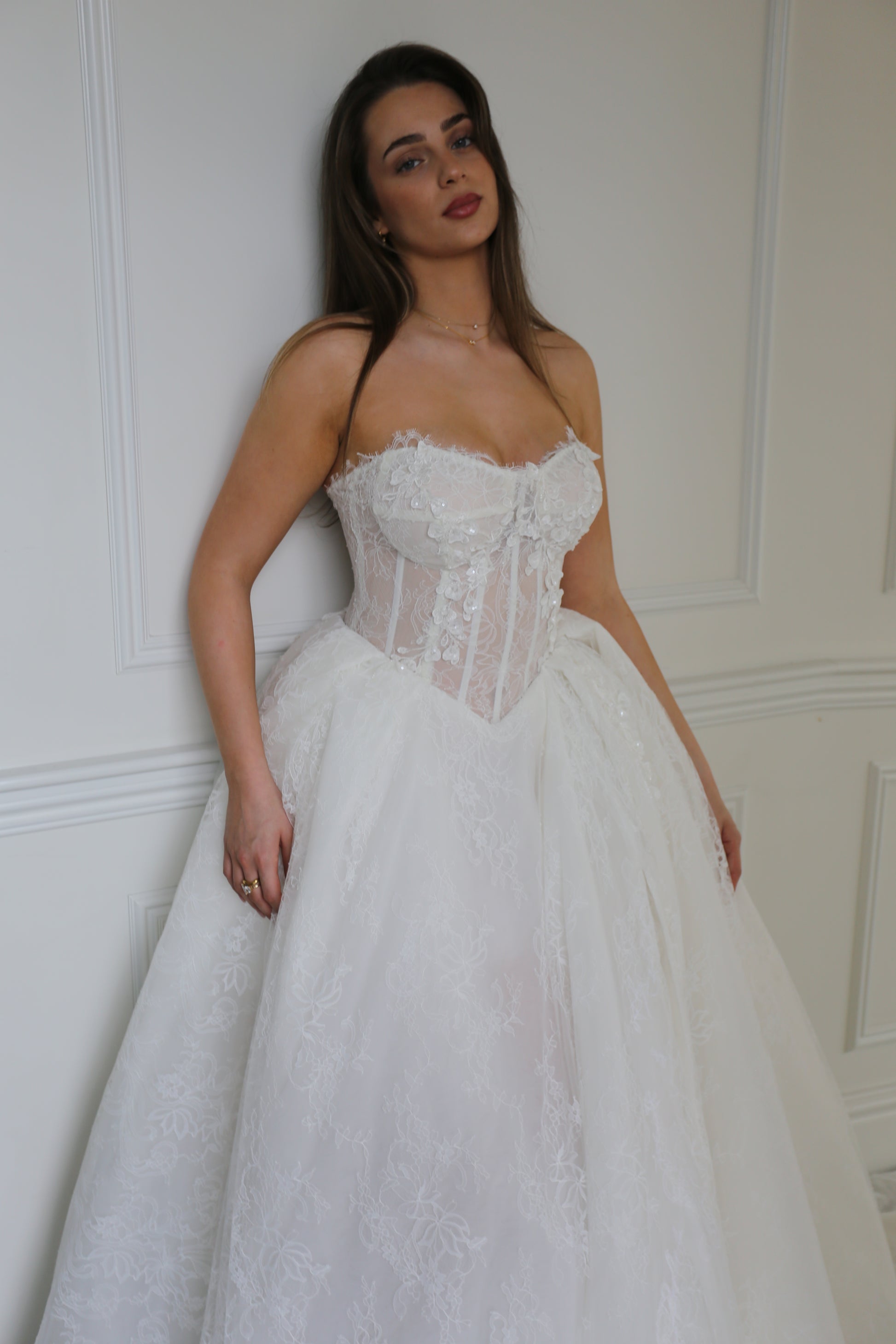 Our Ariel gown is a harmonious blend of modern allure and timeless romance, the wedding dress stuns with its sleek, sculpted silhouette and delicate lace detailing. The bodice, minimalist in structure, embraces the body with clean lines and a daring plunge, while sheer panels of classic lace whisper of tradition. As the gown flares out the hand-cut lace petals cascade down the skirt, catching the light with every step like sea foam.