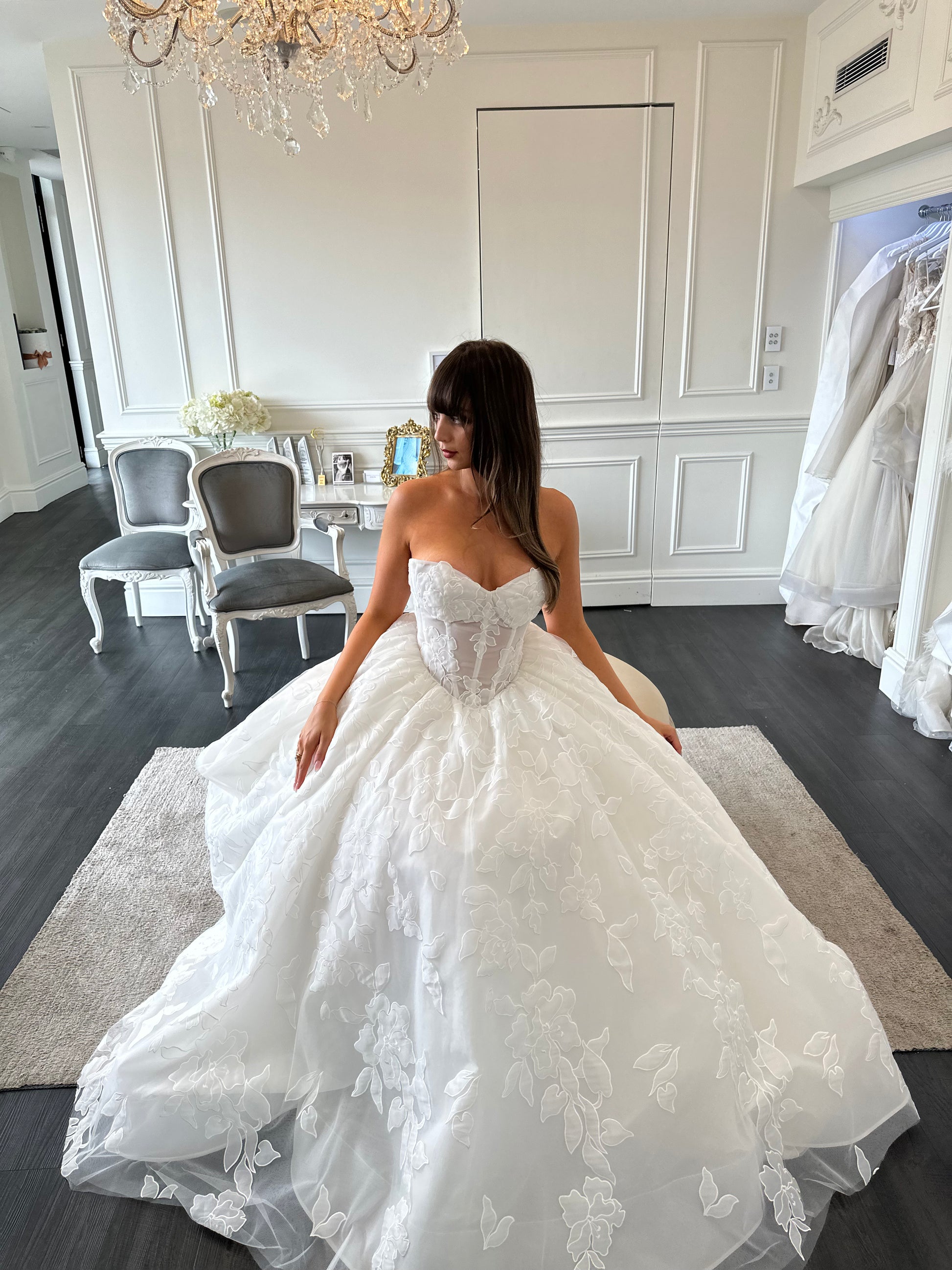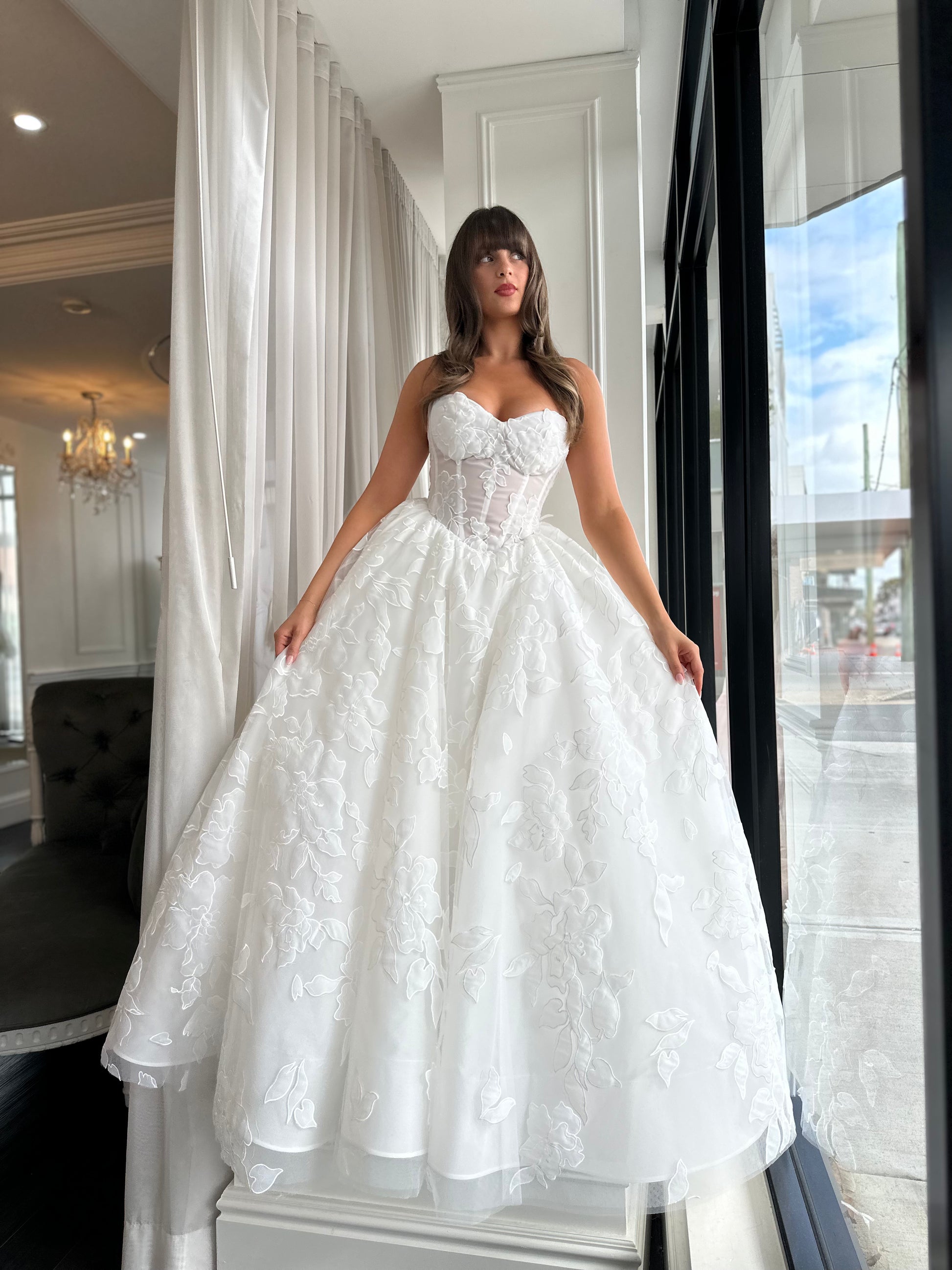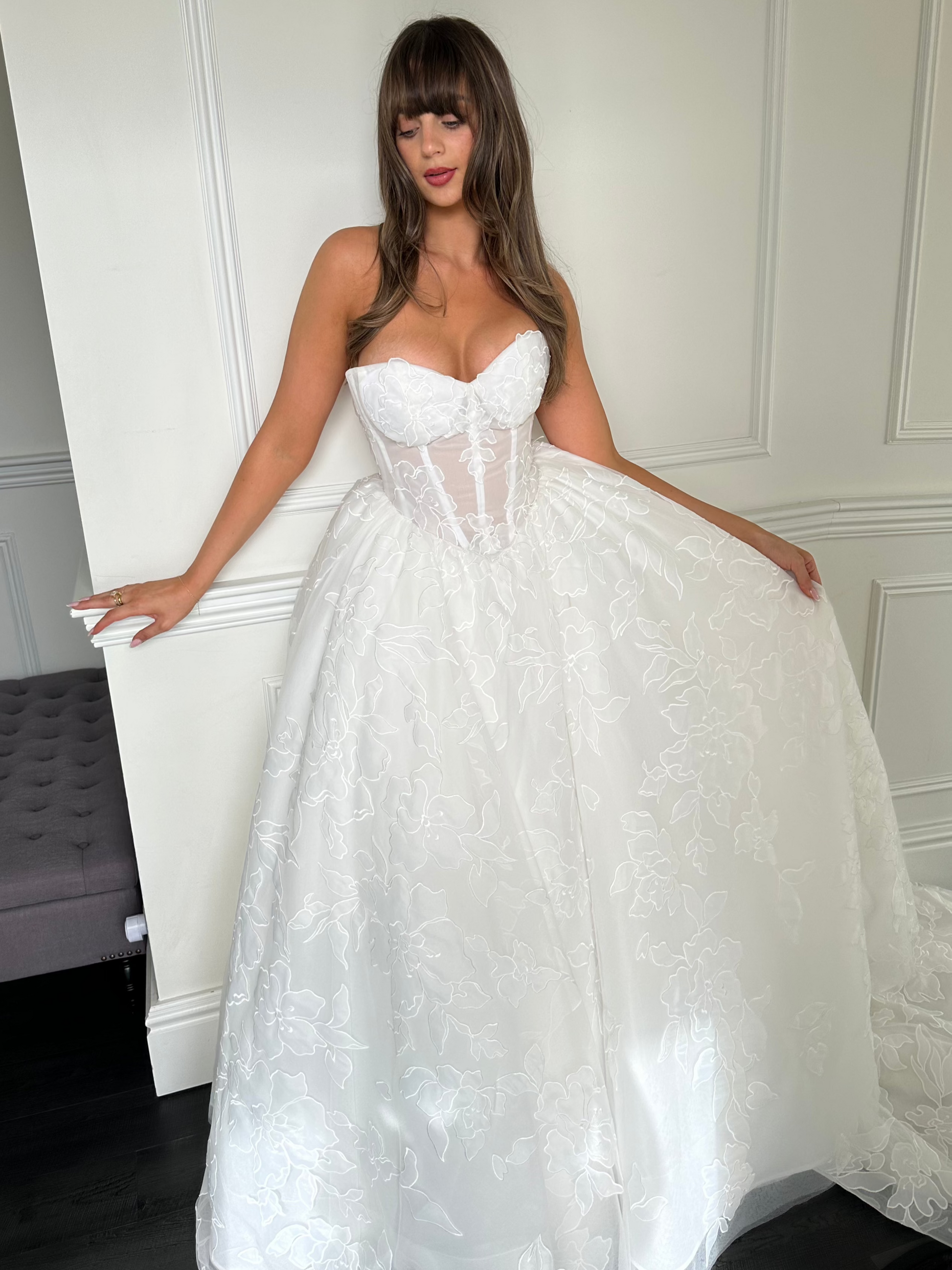 Our Bella gown is inspired by elegance, this creation blooms like a garden in motion. Delicate, hand-embroidered flowers cascade down the bodice, each petal stitched with silken thread and accented with crystals that catch the light like morning dew. The silhouette begins with a fitted waist, then spills into layers of whisper-thin organza that flutter with every movement, evoking the soft rustle of petals in a spring breeze. Hues of blush, ivory, and soft lilac blend seamlessly across the gown, as if painted by hand. With its sweeping train and floral motif, the dress seems less a garment and more a dream, captured in fabric and stitched into life.