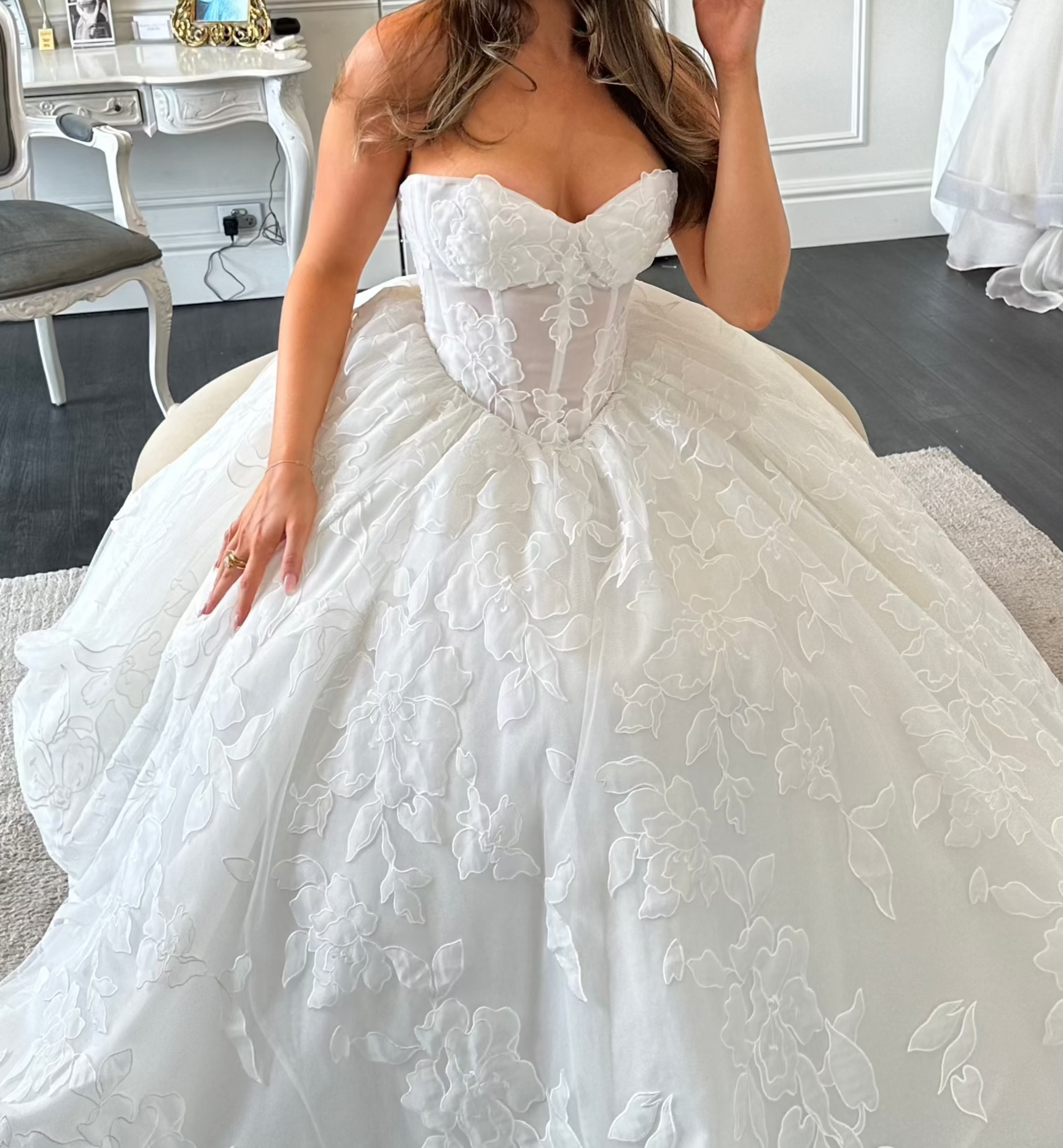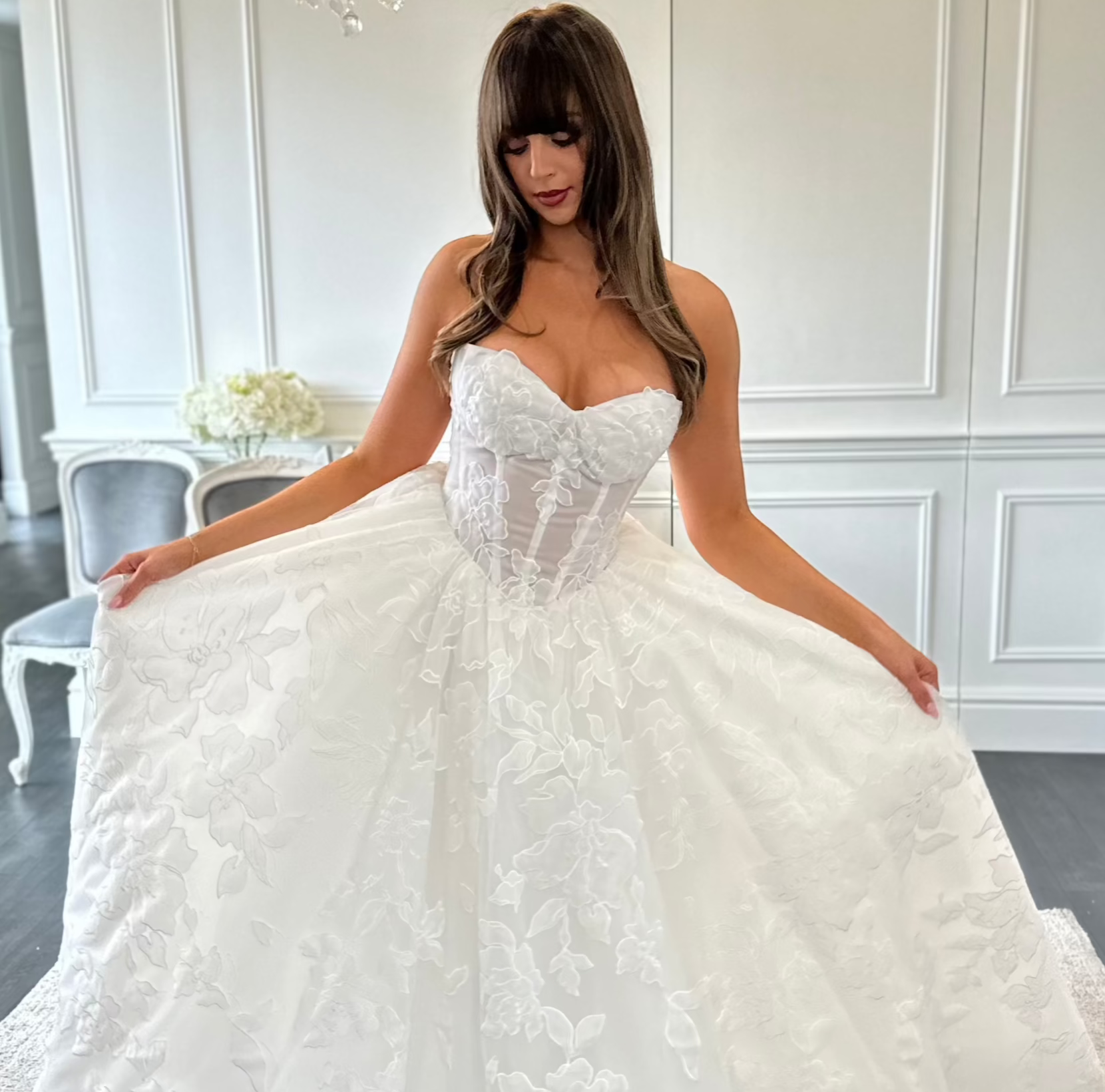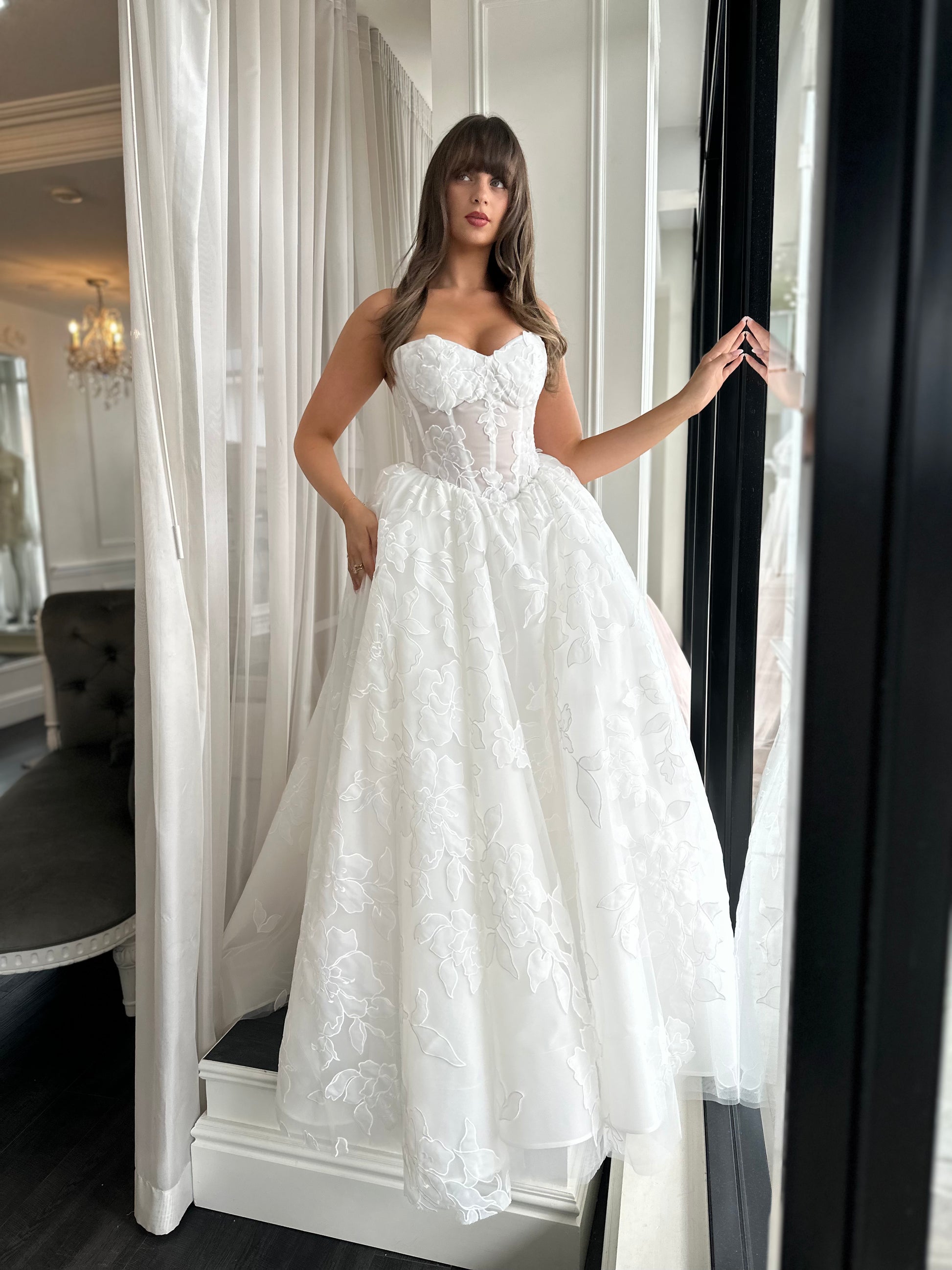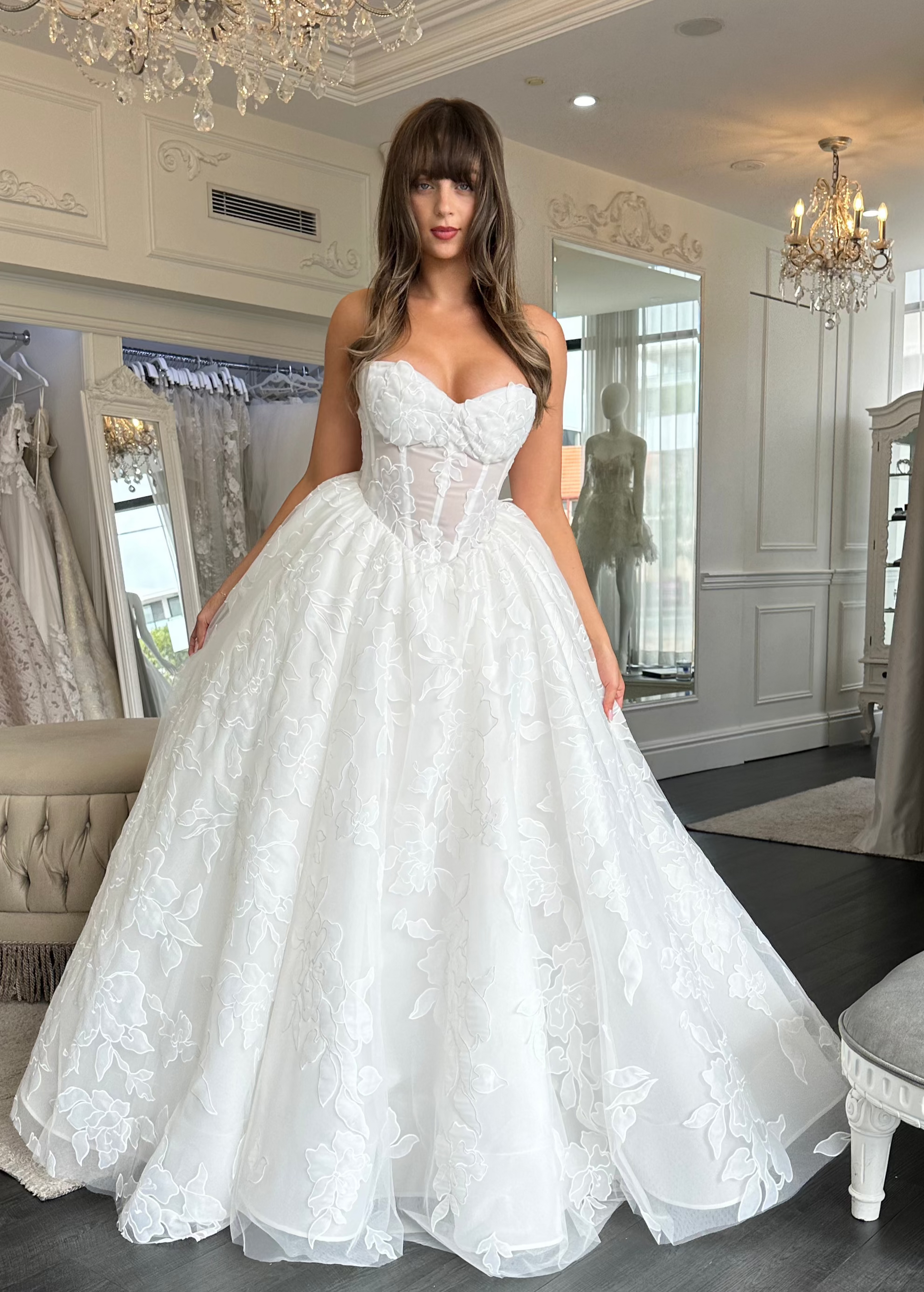 Our Bella gown is inspired by elegance, this creation blooms like a garden in motion. Delicate, hand-embroidered flowers cascade down the bodice, each petal stitched with silken thread and accented with crystals that catch the light like morning dew. The silhouette begins with a fitted waist, then spills into layers of whisper-thin organza that flutter with every movement, evoking the soft rustle of petals in a spring breeze. Hues of blush, ivory, and soft lilac blend seamlessly across the gown, as if painted by hand. With its sweeping train and floral motif, the dress seems less a garment and more a dream, captured in fabric and stitched into life.