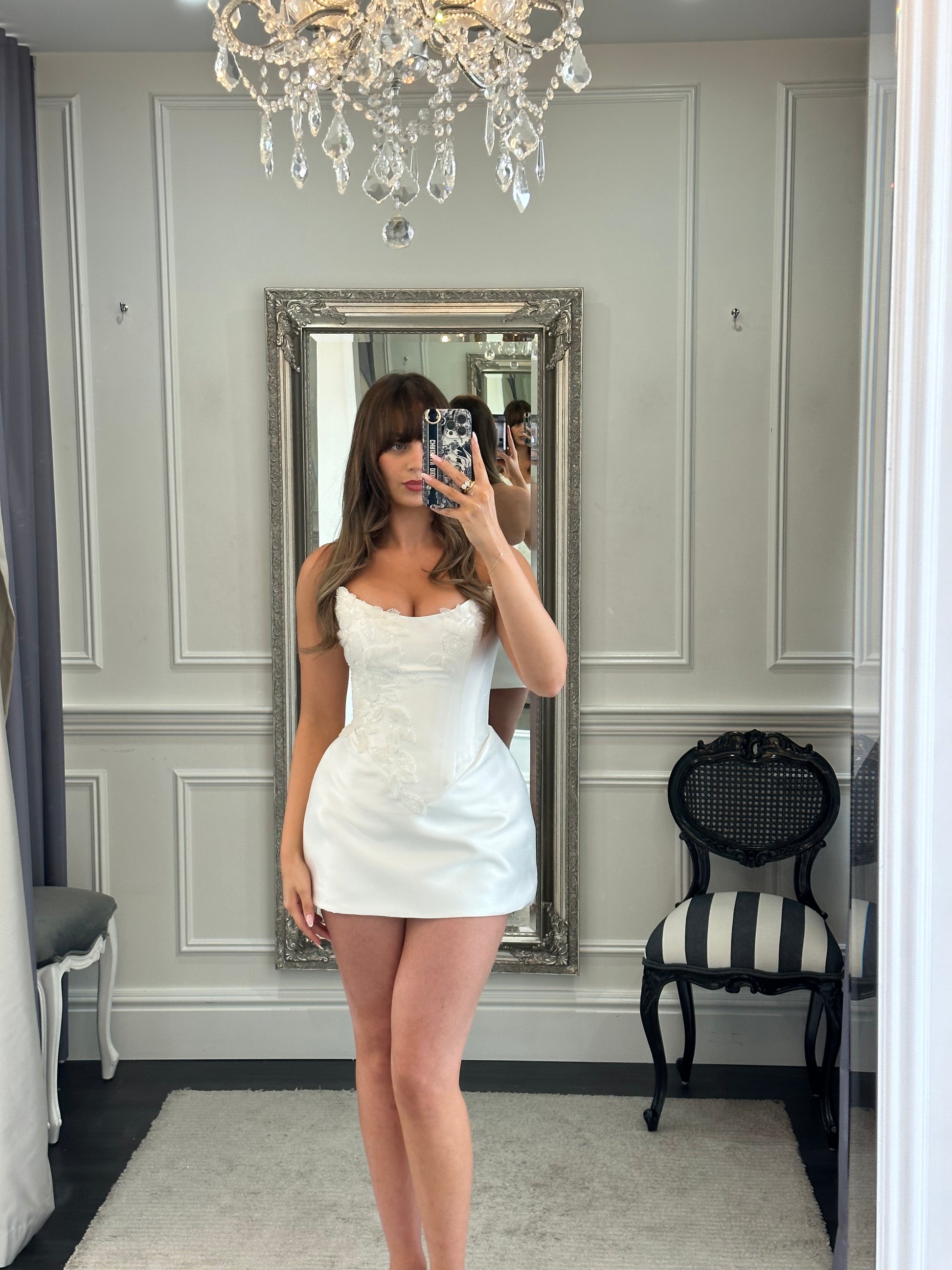 Our Victoria Luxe Gown is a bold and versatile bridal statement—where modern edge meets romantic elegance. The fitted mini base is adorned with custom beaded floral appliqués, offering intricate sparkle and texture. A detachable, flowing overskirt adds drama and movement, featuring a thigh-high split for a hint of allure. Perfect for the fashion-forward bride who wants two looks in one: sleek and striking for the ceremony, then playful and chic for the celebration.